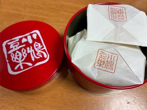 今日は豊島屋の「小鳩豆楽(赤缶)」をいただきました。 ちなみに「白缶」もあるし、箱に入ったものもある。 袋は4つ入っている。 中はこんな感じ。 4個しか写っていないけど、すでに1個食べてしまいました。 「鳩サブレ―」だけじゃないんだな。。